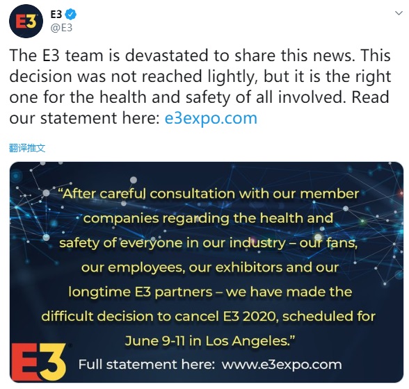 紧接着,E3游戏展的主办方ESA发布了一份声明,正式取消了原定今年6月举办的E3游戏展。