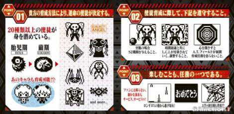 三款外形上分别是初号机、明日香和零款式,内置相同,可以培育20种以上的使徒,育成方法决定了使徒类型,也有可能培育出“那位”角色……