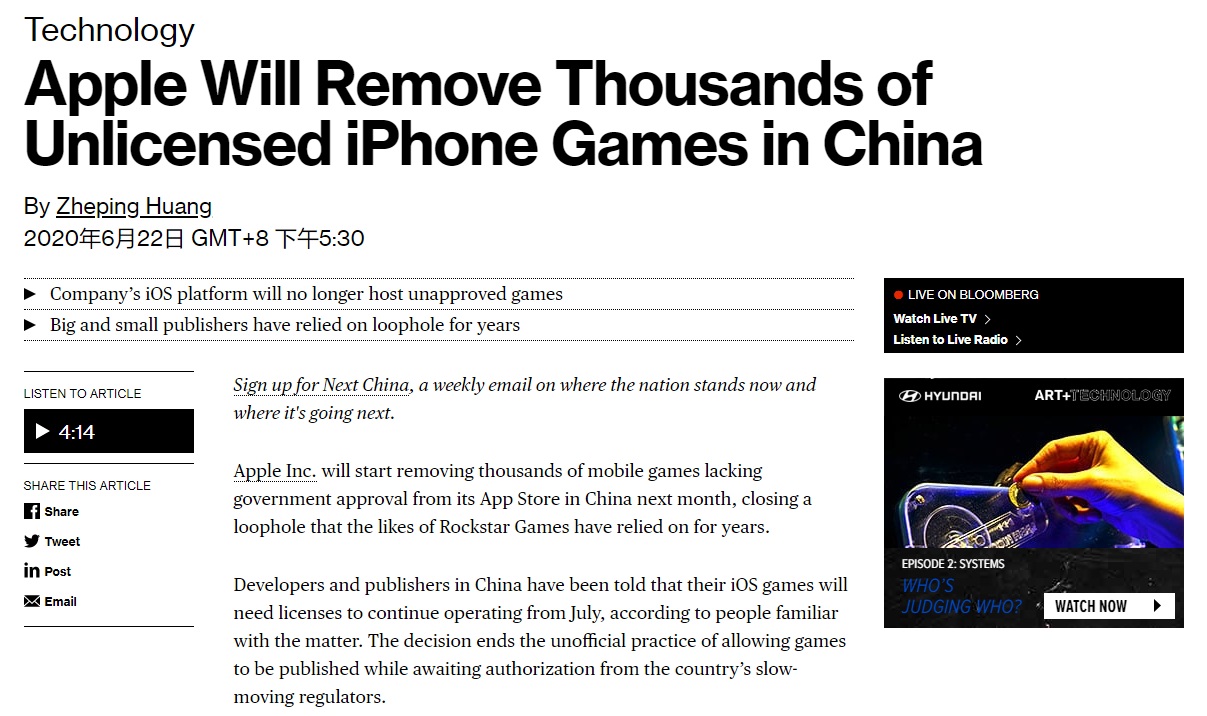 彭博社:苹果7月起将下架App Store国区内数千款无版号手游