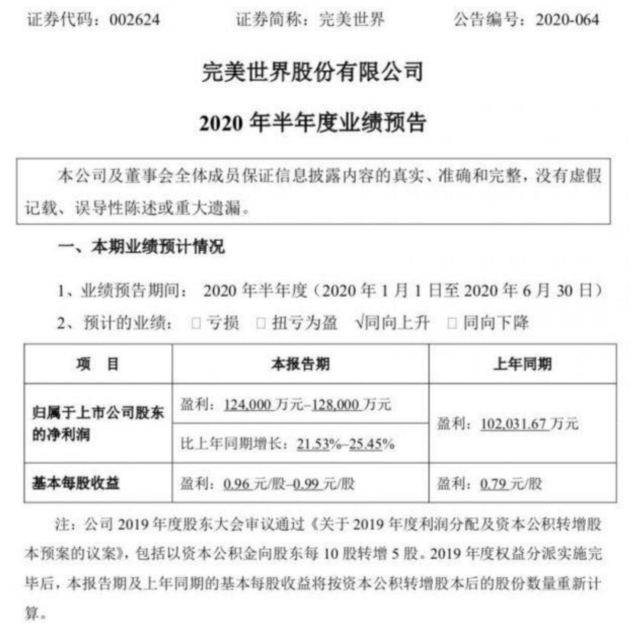 7月14日,完美世界发布了2020年半年业绩预告。预告显示,归属于上市公司股东的净利润为12.4亿元-12.8亿元,同比增长21.53%-25.45%。