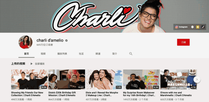 查莉今年也开始在YouTube上发布Vlog视频。她在TikTok积累起的名气和号召力,让跨平台创作变得轻而易举,查莉仅用12个视频就收获了近670万YouTube粉丝。而她的Instagram账号粉丝也有近3000万。