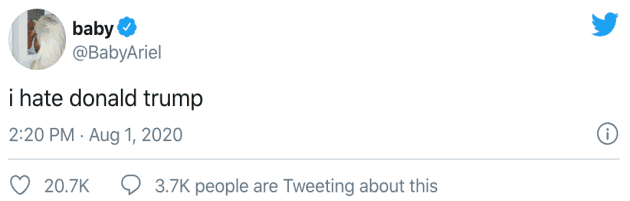 “我憎恨唐纳德·特朗普。”19岁的艾莉儿在TikTok拥有3450万粉丝,是平台最受欢迎的红人之一。她得知消息后,在推特上发布了这样一句话。