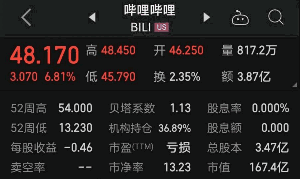 受此消息影响, B站股价大涨6.81%,最新市值达到167.4亿美元。一夜之间,B站市值猛增了约74.7亿元人民币。