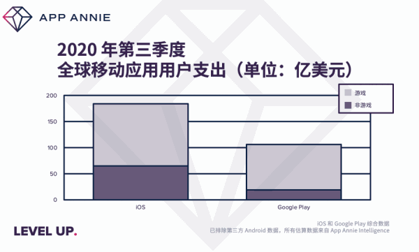 两个应用商店的用户支出在本季度都出现了强劲增长,2020 年第三季度的游戏用户支出与 2020 年第二季度相比增长了 5%。Google Play 的季度环比增长率为 7%,高于 iOS 平台的 4%。游戏也占据了两家商店的大部分消费者支出,分别在 Google Play 和 iOS 上占 80%和 65%