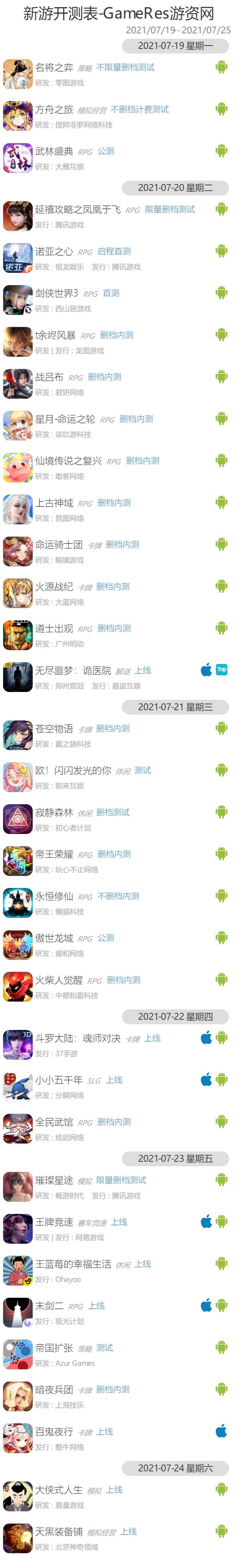 GameRes游资网统计了2021年7月19日—2021年7月25日的最新手游开测信息,共有34款游戏开测。以下是下周开测信息: