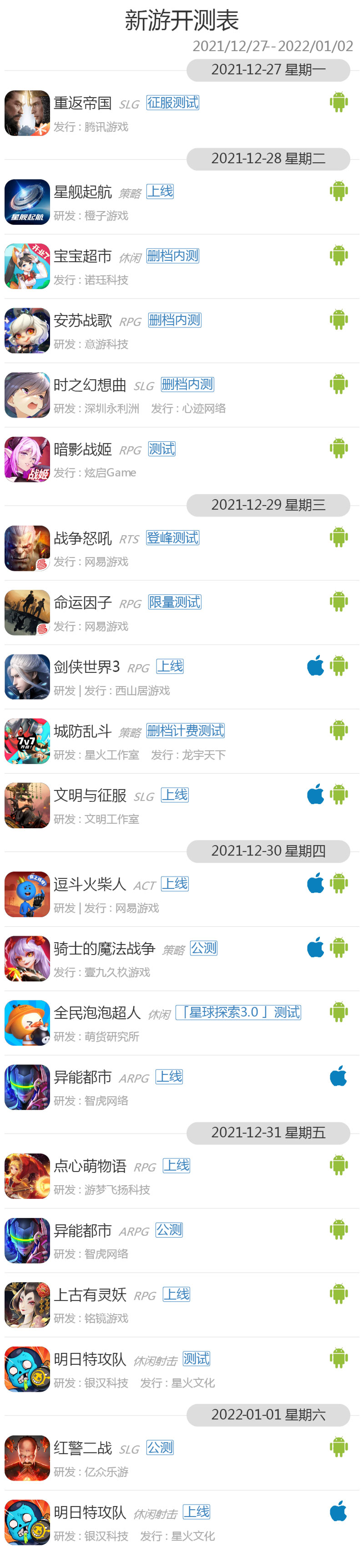 2021年12月27日—2022年1月2日的最新手游开测信息,共有19款游戏开测。以下是下周开测信息: