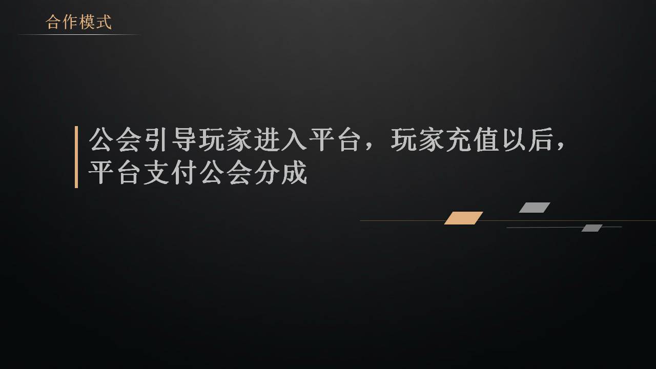 合作模式:公会引导玩家进入平台玩游戏,玩家充值以后,平台支付公会分成,按点位分成,30、50或者70,不同的游戏分成比例也不一样。那什么是公会家族呢?刚开始公会家族并不是专门去赚钱的,他只是玩家的一个组织群体,大家在游戏中抱团取暖,比如创建帮派、家族、军团这些,不同游戏叫法不一样。后来由于联运模式的兴起,咱们做运营的运营商就发现这里面的商机了,我可以提供给他游戏中的道具甚至是返点,让公会长带领他的小兄弟来我的平台玩游戏消费,这样他玩的又好又获利,何乐而不为呢。咱们也可以这样去做,有好多的公会现在都是职业的家族工作室,已经不以玩游戏为目的了,完全商业化的去运作了。